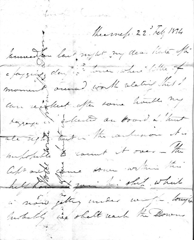 Arrived here last night my dear Kate after a fagging day in town where little of moment occurred worth relating that I can recollect. After some trouble my baggage is collected on board & I trust all right but in the confusion it is impossible to count it over. The Capt only came down within this half hour to join his ship which is now getting under weigh. Tonight probably we shall reach the Downs and if the wind comes round a little may continue our course without casting anchor again. In town I have arranged that you can draw on Greenwood without interruption on my account. I did not state officially any sum but to the amount you might wish. To Mr Mansell I said probably six or more hundred pr ann, however we can settle this when I get out as I can then find out my wants. I have paid all the small bills – Ring &c, Lloyd for boots &c – that I could recollect in my haste. I have dinned Pickford to state his charge for the car & refer it to Edward who with his excellent wife were all kindness notwithstand his serious troubles which I trust & hope will end well.