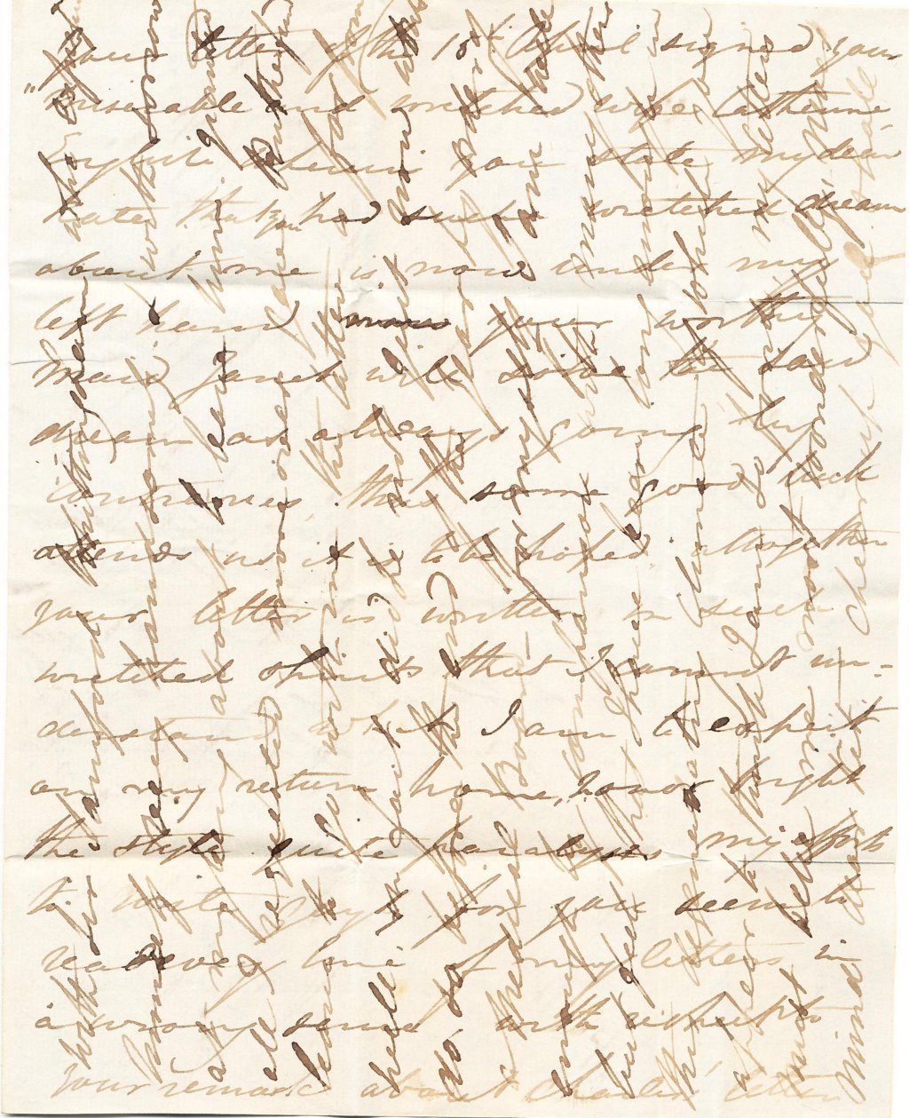 Your letter of the 15th April signed your ‘miserable and wretched wife Catherine English’ wherein you state my dear Kate that you had such a wretched dream about me is now under my left hand. Your worthy maid Janet will solve the said dream, as always going by contraries. Thus some good luck attends us, it is to be hoped. Altogether your letter is written in such wretched spirits that I cannot understand what I am to expect on my return home. Honor bright, the style quite paralyses my efforts to write gayly, for you seem to read every line of my letters in a wrong sense. With respect to your remark about Charles’s letter, I am certain I could not even have hinted that I would not read it. That I had not done so when the mail was making up is very possible, & most certainly your observation about my writing to yourself is not just. No mail has ever left the West Indies without a long letter for you. Of course many must be in such a number exceedingly uninteresting, where there is no subject except that of myself being well & tolerating my exile to the best of my spirit, but as taxing me with going to diner & evening parties and calling upon me to give up the one or the other to write to my family is exceedingly ungenerous to say the least of it. I never attend evening parties in the first place & very few diner, and no one matter of pleasure nor even business have I allowed to prevent a dispatch being duly forwarded to you, much as I am at times overwhelmed. Already I have recd two letters this morning from the Genl respect the memoires he requires connected with our late tour round the Island, and a dozen letters for the ordnance office on dry stupid affairs, all to be gone thro, and enough to sour the temper of an angel. However, all is coming to a termination. My next letter inform you the name of the Ship I sail in for Europe. My late letters before you sent me Col Ellicombe’s will explain that plan of operations was decided upon not to wait for Col Graydon. Before this reaches you I shall have embarked and probably be half over the Atlantic. I have ordered Major Fenwick to Head Quarters, who I expect in a week or ten days, say a fortnight, a short period to turn over the official matters, as estimate &c will suffice. All this is arranged with Sir Samford Whittingham, who expressed himself very handsomely & with sorrow at my being about to leave him, granted all I requested, moreover gave Rutherfurd leave to go with me. The latter is far from well, in fact, did he not quit now, would do so before the end of the year by order of a Medical Board. For myself, I am well enough by comparison with many others, but feel that I have been long enough in this degenerating climate of which you appear to think I am so fond. My letters must belie me most wonderfully. Never mind dear Kit, cheer up, you shall have your husband all to yourself until you will wish he away again ere long. The Name of Anthony Collins made me sick. Some disagreeable association is connected with him that has passed my recollection. But nothing is in my pate now but preparations for England. My sale will be advertised on tuesday and take place about the end of this or first week in the next month. Therefore on the arrival of the next packet I shall be free and propose starting by a Sugar ship, as the packet lays 5 or 6 days at Trinidad, then to Grenada, St Kitts & St Thomases, which makes the voyage very tedious & over much of the same ground I have recently passed over. Another inconvenience is landing at Falmouth with baggage – certainly mine will be light but still it is lumber to drag about so great a distance and it is very probable I may succeed in landing either in the Isle of White or at the Downs. The cork leg is on the start and it shll have little rest until I am on your side my dear Kit. As to Portsmouth or elsewhere, I care not as to station. I would rather not go to Ireland in a back settlement. It’s all one to me when I have my family with me. The Staff Ball went off well the night before the last. It was kept up with spirit until morning. A very handsome letter of thanks for our exertions as three committee men was recd yesterday from the Genl. He was much pleased – about 300 persons were collected. Fancy my astonishment – Lt Tinling RN walked in two days since from Jamaica. He has comd of the Charibdis I think, & was put into her by Comd Douglas who sent his kind remembrances to me – he is much liked. Don’t scold any more – this will be nearly the last letter you receive, the next will give the day I start. The Misses Chads looked extremely well at the Ball. Tell Fop & Flush to take care of their cats. Now recollect: remember me to all, love to my children, regards to Miss Parker & what to old Jane. Believe me my dear Kate your very happy & contented husband & affectionate