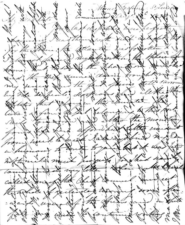 Your last dispatches were perfectly charming. I read them with such delight that for the time the Atlantic was forgotten & I almost fancied myself within the sphere of home, but too soon the phantom vanished and the Mess dinner drum brought me to my senses and the fact of being still surrounded by vile serpents, scorpions and all the other reptiles that glory in this climate. The Cuba, a fine vessel belonging to this Port, sails tomorrow and altho the monotony of one’s life here affords but little incident from week to week, I always find my pen in humour to write to you. But it was fated not to make much progress for I had scarcely commenced when Mr Berril called, one of the Chief Council, and set the whole of yesterday morning. Soon afterwards several of the officers, and in spite of my wish to continue writing, unceasing interruptions prevented it. However, the most important part that I had to perform and which occupied the remainder of the day until Mess time was having to meet Leicester Smith at Castries. He has been sick at Pigeon Island some time & could not return to Barbados with Sir C Smith. It commenced by humbugging – you are aware that that talent exist to a remarkable degree in the members of the family holding commissions in our Corps. Lt L can carry it on famously and at last what with performing sick and getting frightened out of the few wits he has, he actually produced a fever, not of the climate but a low nervous one which has reduced him exceedingly. He was brought to Castries in a boat & eight of my blacks carried him up the mountain in a hammock. He will soon recover, in fact the exertion & finding himself among his acquaintance had a wonderful effect. This morning he is fatigued but better generally. I still continue in excellent health, and could be in mad spirits occasionally were it not checked by thinking of Wickham & the feeling that I am transported from you for so long a time. How I laughed & fancied I saw Mr Hawker telling you that Fred ought not drink so much Porter. Why the total amount would be but two tumblers per diem. It is the perspiration it promotes that does me so much good. Something you must drink, & in my opinion the light porter sent to this country is preferable to any other beverage. I have tried claret which will not answer, Madeira and water better, but the quantity you drink to satisfy thirst end in a restless night. Thus I have come to the decision my dear Kate even in opposition to your advice & Uncle Hawker’s that generous porter without a particle of the water of this country is the best when you take exercise. All the water we have here is collected in Tanks and preferable to that at Barbados which is strongly impregnated with lime. My inside belt parched out when there. However frequently you may write, all your letters are most interesting and of course acceptable; in truth had I not the constant expectation of receiving them I positively think I should fret myself into fever. Kate, Cary’s, with Miss P’s letters in addition, are the greatest possible comfort to me. I mean to reward them with such collections of Insects that I have my doubts whether you will not have to stick on your front door not at home – the curious will be so attentive in their visits. My room is a daily lounge for all my messmates who come to witness the additions making hourly to my museum. So Arthur Goset is married, & in a paper I took up about a month since I observed that Strangeways was blessed with a family – Madame had presented him with a daughter. I am pleased to find Augustus is disposed to be musical. I must confess I am greatly annoyed respecting Mr Ambler’s mode of proceeding. I will write, but I think if Charles or Col Harding would look into the matter being on the spot, it would have more effect. Augt ought at latest to pass at the next Examinations – Xmas I think – or he will be late. Tell him from me there is no fear whatsoever of his getting on when the Cadetship is once obtained and that the examination is trifling. If Mr Ambler does not give satisfaction, take Augt away, first finding out through Mr Drummond or Murphy a person that will what is termed cram him for passing, striking a bargain with the tutor for the time. I shd write to Augt again. Did he not get a letter or two from me? As to Fred’s letters, I am exceedingly entertained with them, he is an excellent fellow. I trust he may never alter for the worse. The dear girls must take the will for the deed just at present. I am so taken up with the Estimates & work going on that I have not made sketches or can I write as I could wish, or to Miss Parker until I feel idle again. I observe the vessel shaking her sails out therefore must come to a close. Edward will find out when the Cuba returns and from what Dock. I shall write more fully by the next ship or packet. Love & regards to all, not forgetting my good friends at Catisfield. The Negroes won’t work & there is for the present a bit of a row – no soldiers will be required.