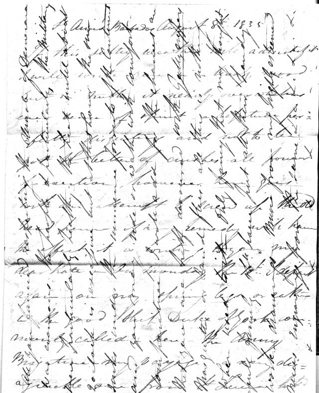 If this sultry weather will admit of it I will write you in lively mood, but in truth it nearly overwhelms ever sense of spirit. A lassitude perfectly disgusting and not to be got the better of crushes all power of exertion. However, here goes with an attempt to screw up the old head piece. If any remedy will have the effect it is writing to you my dear Kate. On Monday 10th I depart again on my spring legs or rather on the good ship Duke of York, commonly called here the Army Brigantine, my voyage a very disagreeable one from St Lucia to Hd you have already been made acquainted with, and so soon as I reach my destination, which will occupy about 3 or 4 days, I shall write you by the first vessel that sails for England, giving you an account of my reception in the new quarter it is my lot to occupy. When last in Demerara nothing could exceed the attention I recd, not much certainly from the Govr notwithstanding he made a great display in words, but in many other families the hospitality was unbounded. Since that time some of the best have gone to England, still I have no doubt that I shall find society enough for after a round of dinner parties it becomes weary work being buttoned & braced up in red and gold lace. Sir Charles Smith surprised us on the 23rd Ult by embarking suddenly on board the Vestal Frigate Capt Jones for Guayra where there has been some attempt at a Revolution. By the last accounts recd here since his departure, there has not been any arrival to confirm this intelligence. The object is to recruit – his health has been doubtful of late, in fact I observed a great change for the worse in his appearance. He has been too long in this climate and requires a change. It will be a trip of some weeks as there is a difficulty in getting back, what is termed here a dead beat, and it will be necessary that he makes his way to St Thomas in order to catch the Steamer coming from Jamaica. Before he quitted I passed an hour or two at Shot Hall. He was out of spirits but gave me written instruction relative to my new Government, putting Thompson, a 1st Capt, under me for his sins, of course by no means an agreeable office for me. I am also to bring a Clerk of Works to his senses, probably to get rid of him, visit Berbice once a quarter and several other points where forts are established amongst the Indians, the names of which are te-totally beyond me at present. When I have lived a few months with the Buck and other tribes of Indians, I shall be enabled to amuse you with a description of some of these outlandish stations. By the bye, I did not forward the Boxes as I proposed, not having sufficient to make up an interesting box for Wickham. Ah! how I wish I was there – it’s far distant I much fear. Some officer mentioned at Mess yesterday that Mat Dixon had got his promotion. All you fancied respecting the climate of Demerara was erroneous. The people & particularly the Military, were particularly healthy. The heat until about 2 oclock is excessive, but at that hour the sun sinks under the immense forests of the Continent and you may ride or walk with comfort. comparative I will add, for the chances are you are half devoured with Gallynippers, Mosquittos or sand flies. All this is nothing when used to it. Only fancy that my thoughfull family shd have put all their handy work, drawings, music from my highly esteemed nieces, engravings from the same &c &c &c &c at the bottom of a box of Preserves to be safely handed over by Col Studd to Capt English & coming to a climate 87, 88 Ther in the shade, with the probability of their never coming to light or the Jars bursting and letters drawing, engravings, work &c &c all being destroyed. Even the black handkerchiefs that would not tie in a knot, far less a bow round a tom cat’s throat, became Jamed & well Jamed. It was not until many days after I arrived here that, observing a fractured Jar, I directed the sert to unpack the box. This was done but the lower story did not come to light. About a week back, when the box was condemned to be remodled into a Monkey house for poor little Moses, Sambo came upstairs. ‘Massa, see em letter an’ other ting all Jambed.’ Sure enough they were & he licking his fingers. This will account for my not thanking you all for the little souvenirs. The tin Mug from Miss P I think exceedingly pretty – it was not injured. The bottles ornament my dressing table, I admire them much & have discovered the chip at the bottom of the one Kate sent. I call them Kate & Cara. The Rosettes, the latter made for my horse, & a shewy fellow he is acknowledged to be. I shall mount at the Demerara races which I understand are preparing. The music is a great treat for the Bands & that of the 86 Regt at Demerara is superb. Sambo washed the drawings whilst I was out & on returning brought them up saying ‘him all right Cap-an now me wash em all straight’, and so he had at last sufficiently recovered them that I can put them into my book. Cary has improved very much in her touch & the young uns will draw extremely well if they persevere. Fortunately the two Engravings sent by my dear Nieces are not touched by the Rasberry. Thanks & lots of kisses to all those who have bestowed so much thought on me. From the date of my last to you of 22nd July I have scarcely ever dined at Mess. The description of some of these parties I shall write in Kate’s letter which I am in hopes I shall find time to write this evening after Mess for the Mail boat sails tomorrow. The report on dear Augustus, so far as conduct, is favorable enough but the loss of places is a very serious affair unless he can retake them. If he is successful in getting a commission in our Service or even into the Artillery, the loss of a step may alter his promotion of several years. I much fear he has been in an idle lads’ room which is a very great drawback to a boy at first starting. When I was at Woolwich, Capt Macauly told me that Oldfield’s boy was unfit 