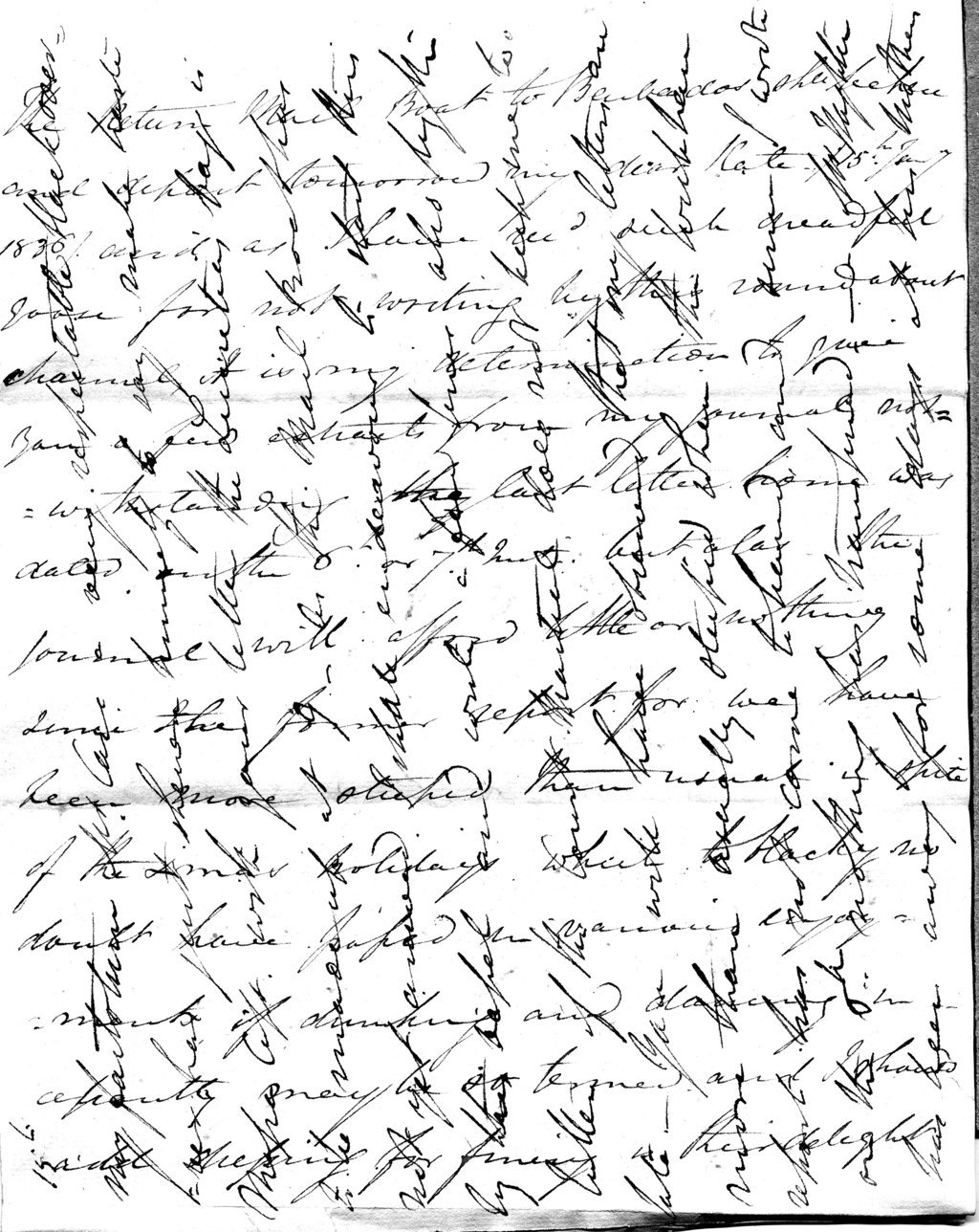 The Return Mail Boat to Barbados shd be here and depart tomorrow my dear Kate – 15th Jany 1836 – and as I have recd such dreadful goose for not writing by this roundabout channel, it is my determination to give you a few extracts from my journal, notwithstanding the last letter home was dated on the 6th or 7th Inst, but alas the journal will afford little or nothing since the former report, for we have been more stupid than usual in spite of the Xmas holidays, which to blacky no doubt have passed in various enjoyments, if drinking and dancing incessantly may be so termed, and, I should add, dressing for finery is their delight. The upper class and Military have been slow in the extreme, nothing going forward to cheer one. On the contrary, the Genl Court Martial, still sitting, has cast a gloom over all and a fear of expressing themselves freely on the chance that every remark will be repeated in the wrong quarter. In fact all is carried to his Excellency, which ought not to be, and he courts the system. You recollect his performances on the Survey of closetting all the young subs – I fear his information is obtained here as to all that passes much in the same way. However, this is between ourselves. The garrison evidently partake of the disagreeable feelings introduced throughout the Colony by the Court on Sir Andrew Halliday, 2 or three of the charges being for scurrilous attacks and reports by letters of the Colonist. I have not attended the proceedings, but from what one picks up on these occasions it would seem that he will be acquitted of most of the charges. How glad I shall be to be able to say adieu to my little brother officer, altho I must confess he has made himself very agreeable in a way. An order has this moment been put into my hands appointing me President of a District C Martial tomorrow. This is the third within the last fortnight that I have presided at, and with the Garrison duty by the weeks, you may suppose there is but little time left for one’s own duty or amusement. I really quite long to get clear of this command, not that I dislike the local, but during Sir Com’s reign it never will be endurable, all the world being at loggerheads. Hold, enough of this, you will exclaim. By the bye, letters have been recd here stating that 8 Arty Cols are to have the choice of selling. Will the REs have the same in proportion? – it is to be hoped. Nearly four pages I have scrawled over and not one word of reproach yet about sugar ships, unkindness &c &c &c. Still, not one letter did I receive by the last packet which came to anchor on the 9th Inst. Every person I met had letters and some remark to make on them. No doubt the Inspector Genl is absent & my dispatch was laying on his table for the want of a frank. Good news sometimes travels slow, thus I hope that the next will bring joyful tidings that Augusto has passed, promotion for his father with various other good accounts.
