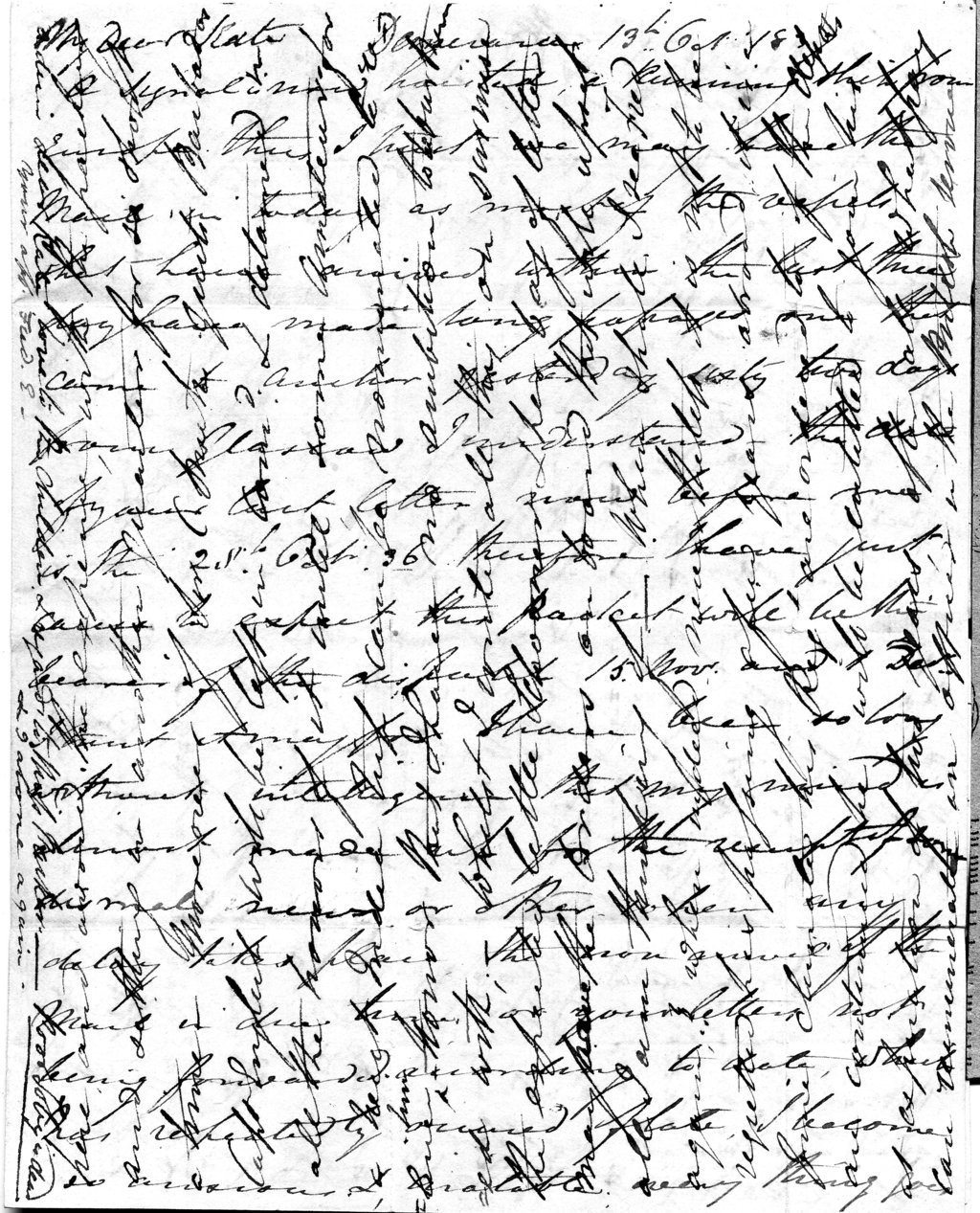 A signal is now hoisted, a Rumming ship from Europe, thus I trust we may have the Mail in today, as most of the vessels that have arrived within the last three day have made long passages. One that came to anchor yesterday sixty two days from Glascow I understand. The date of your last letter now before me is the 28th Oct 36, therefore I have just cause to expect this packet will be the bearer of the dispatch 15 Novr and 1 Decr. I trust it may for I have been so long without intelligence that my mind is almost made up for the receipt of some dismal news or other. When any delay takes place, the non arrival of the Mail in due time or your letters not being forwarded according to date, which has repeatedly occured of late, I become so anxious & irritable everything goes out of order & I settle to no pursuit. The Cruickshanks sails this evening for London, therefore it is as well to give you a few lines reporting my excellent health. Spirits I never am much in want of & that part of my system will be improved if the English letters due since the 7th Inst reach Demerara today with acceptable tidings. By this time you will have made the acquaintance of my much esteemed friend Capt Tait and I beg you will make much of him. There are few of such sterling worth to be met with. How little did we think when last parting at Barbados that it was his destiny to be relieved so soon and to be quartered so near all those I most value in this world. By what caprice or what not, the change of arrangement respecting my being quartered at Barbados took place I cannot guess. However, it has only put me to a trifling inconvenience. I sold off all my little all & now find few traps to fill the large boxes with. Possibly it has been for the best – Barbados has suffered in the last 4 months with more sickness than any of the other Islands, altho my excellent constitution might not have been attacked. Still you would think every packet’s news would be the Capt in a fever. I am in a fever – to get home, more so if possible than ever. Tait’s report of a relieve in 1 Capt & 2 Sub is reviving, but they are so long making their appearance my period of transportation will be drawing to an end. It will therefore be of little consequence whether I remain here or go to Barbados. In truth, the excitement having passed by, I would almost prefer dragging on my existence to the wind up of my term here and avoid the expense with the packing and settling in another quarter for so short a time. Moreover, if Sir C Smith quits Barbados, Capt English will be left in comd & detained in all the honors of it until some Amateur for a West India trip can be nominated to relieve him. Honor that I have no ambition to be burthened with. Whilst I write all this on surmise, the expected little Schooner & her bag of letter may have the Orders on board that will upset all I am thinking of. When shall I see Fred again? When indeed, nevertheless it is not to be regretted his passing a few years abroad. It is a fine climate his Regt are ordered to. If the depots are continued, he will be entitled to join his at expiration of two years. After all, what pay can remunerate an officer in the British service sufficiently for his Colony duty where he serves in all climates, hot, cold & pestilential, separated from his family and friends during the most interesting of his and their advance thro life? In all probability his fate is little better that of a malefactor. He is a gentleman convict and humbug’d that he is serving his country. How I wish I were home! Even to get out of this station would be a blessing. I only at the present moment allude to being with Sir Com – our fight has for the time terminated and he has been ordered by the Lord of the Treasury not to make Grants of Land without a reference to the Board of Ordnance when their property is in the neighbourhood. He is a dangerous fellow & will if he can pay me off, I have no doubt, & has such a wretched set of sycophantick creatures about him that one feel in close quarters with an Inquisition. A fine room and other additions now under my superintendence at Camp House, his residence as comding the Troops here, causes somewhat of a more polite intercourse between us. This complete & nothing to expect from me will be the signal for another attempt to overwhelm with his overbearing haughty conduct, unless by good luck I am moved in time. As Charley often remarked, I’ll grin and bear it. Last week we had another Lord Mayor’s fools shew. Fortunately the rain which came down in torrents prevented most of the morning folly, but a Levée of all, I may say all, for Tailors Black & Brown & every other that could get a coat jostled [word missing] Red Military in every direction. A dinner party of 70 completed the farcical adventure of the Representative of Majesty for the day. I hope all digested the bad fare & worse wine as well as the Capt of Engineers who laughed himself to sleep. I saw Tom Naghten, quite well, yesterday, full of preparations for a Bachelor Ball to be given on the 27th Inst. So soon as the Rooms are complete the Repr of Majesty gives a Fancy Ball – he tell me so is his intention, thus to shew I bear him no ill will I am putting all my strength in, self & Carpenters &c, & even Tailors if required by him to get on, finish & prepare for our next brush. I was delighted reading the account of your gay dinner. I am always pleased to learn that you are enjoying yourselves. I fancy that you have been to Town on Gusto’s affair with Mr Dixson. A few hours will prove whether or not I conjecture right. It is most agreeable to find that family matters are on a footing with our good friend at Catisfield. Regards to all, particularly my old shooting companion Uncle Hawker & all the love possible to the Gardiners. I nearly wept when reading of their unfortunate accident. I trust they are not so disfigured that I may not kiss them, a pleasure I have promised myself on returning af