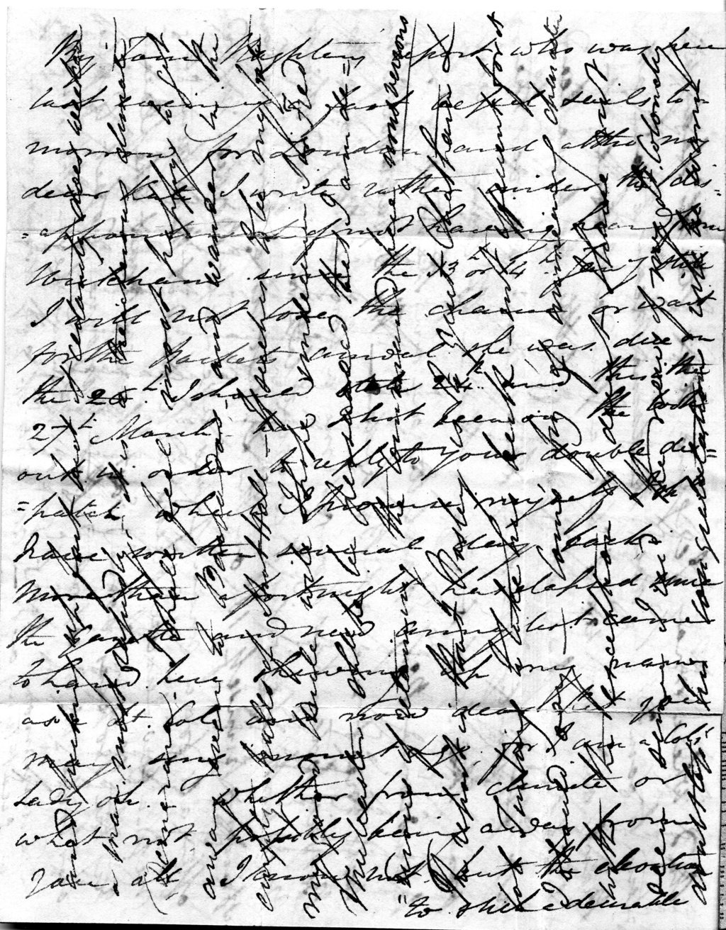 By Tom Naghten’s report, who was here last evening, a fast vessel sails tomorrow for London, and, altho my dear Kate I write rather under the disappointment of not having heard from Wickham since the 13th or 14th Jany, still I will not lose the chance or wait for the packet’s arrival – she was due on the 26th, I should state 24th, and this is the 27th March. Had I not been on the look out in order to reply to your double dispatch which I promise myself I shd have written several day back, more than a fortnight has elapsed since the Gazette and new Army List came to hand here showing up my name as a Lt Col, and now dear Kit you may sing ‘Mount & go, for I am a Col’s Lady oh!’ Whether from climate or what not, probably being away from you all I know not, but the elevation to such a desirable has not had the effect I always thought it would have. I expected to greet the news with my heart overflowing with joy, but this feeling has in no way as yet shewn itself. The draw back, I verily believe, is the chance, in fact the almost certainty, of my being booked in to relieve Sir Charles Smith in the command, and thus my castles of home and the pleasures of your society at Wickham for a month or two will all vanish. In my last letter I stated he had sailed for Tobago. Since his departure it is reported he recd letters at Trinidad which caused his return to Barbados, and from thence Lady Smith joined him to make the tour of the other Islands. That he will go to Gibraltar I have not much doubt, in fact he told me he shd accept it. He also mentioned that orders were left at Barbados to send Capt Briscoe here immediately on his arrival. You may suppose I am in a disagreeable state of uncertainty. It makes me laugh when I think of you all holding up your heads to the doubtful, with Kate nodding her head to those who have argued the point with her: ‘You observe now I was right’. Papa is a Lt Col with three under him, it is to be hoped with five soon as it adds to the rate of pay. Since I last wrote nothing has transpired out of the usual routine, various [word missing] both Ball & diner & the huge Bunbury has sailed for St Lucia rather in alarm as to its climate. He was not favorite of mine, and from what I understand has rather humbugged the people here, the parting I have not attended. In truth, the very day the Gazette came to hand I felt that a cold was hanging about me. I tried to shake it off & joined a large dinner party, but in spite of being Coloneled right & left it would not do & was glad to get home. It was last saturday fortnight. From that time until within the last two days I have been far from well with a sharp touch of Colony fever & ague. However, I thank God, with care & Dr Whyte’s medicine, I am all right again and picking up fast, but it certainly does weaken a man most rapidly. It is a treacherous climate, Demerara. I shall feel most happy to get away, even to Barbados, and wander in the empty halls of Shot Hall, if such is to be my fate. My good Uncle will, I hope undeceive Sir Fred Mulcaster shd he be persuaded that I am desirous of retaining the command here – nous verrons. The report is that Pasley is to quit Chatham & Col Tinling is to take his berth – not efficient for it I should say. Com’s fiz of unmeaning character with the exception of deceit I have not seen since I recd the news of my Lt Colonelcy – doubtless his congratulations will be warm. And where, may I enquire, does the Col’s Lady intend to comd? Does Madame mean to join at Barbados, or wait like a prudent soul at Wickham? I would give a little to have heard all the party making their remarks over the fire this last two months. Of course, a very handsome Pr of Epaulettes are on their way & will meet me at Barbados. The Dispatch boat from Berbice today has brought me a long letter from Mr Molesworth. He writes to congratulate & in good spirits at finding himself 18th on the Lt list. It’s a sorry lookout after all for a man of his age. Capt Bordes! My goodness – a few Survey bucks will find it their turn to try the Tropics. Some vast changes must take place in our Corps. It is reported that Burgoyne, Gosset, Gipps & Drummond are to quit. When we begin there is always a great turn out. All sorts of gay doings are in preparation for this week. Tomorrow the Races commence and continue the day following, thursday a Race Ball and the next day private theatricals. In the last Naghten takes a part – he would not tell me what as he said I should laugh at him. I may join in some of these amusements if my timbers feel strong enough, but fear taking cold & would of course prefer starting from hence a jolly fellow rather than an invalid. We shall make an effort at all events, if only to be addressed Col – what a farce. My friend Hooper 69th has got his Brevet Mjty, & Molesworth writes that he has mounted a huge pr of gilt spurs & Brass sword scabbard, and is flaring thro the town of Berbice in all directions. However, he is an excellent fellow. Sir C Smith met Molesworth in a most friendly way, he states, and that old affair of court martial are forgotten – so far well. How are my chicks? What is done about Gusto? Have you all escaped the influensa? I trust so. We have the small pox here & the [word missing] in a dreadful fuss about it. Banks, railroads & Steamers are all the rage here. It is intended to construct the railroad between this & Mahiaca passing thro numerous estates & the latter to ply from the Essequibo River & bring up produce. Improvement is the order of the day & at the same time Govr Com & his Council go quarrelling on like winkee. You could not hear more of dear Fred. What think you of the Comd there? Hey? Regards to my good Uncle – I do not write to him as you are so near, it would only be a repetition. I feel right well this evening so expect to be all sound tomorrow. Remember me to Miss Parker & my dear nieces. Tell them to prepare for I’ll give them all such a tr