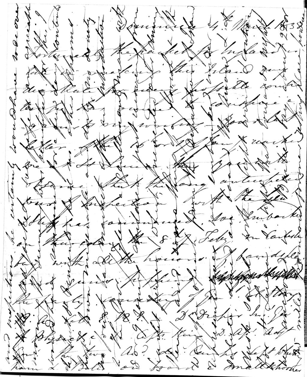 Fortunately the packet for England is late in making this Island my dear Kate, for every possible contretemps has occurred to conspire against my writing. Your last letter of the 16th or 17th of Jany reached me at St Lucia, thus you will observe that the long anticipated tour of Inspection with the Genl & Staff has commenced. We embarked on thursday the 8th of Feby in Carlisle bay with all the honors of bands playing and guns popping, the party consisting of Genl, Col Story RA, Col E RE, Dr Draper Insp Genl of Physic &c, Capt King D Asst Adjt Genl, the two Aid de Camps Capt Whittingham & Bates on board a small schooner hired for the purpose. Well enough as a passage vessel, in fact formerly filled up as a Yatch, but so small that we were much crowded, and all the party began to hide their heads very shortly after she was under weigh. In spite of all the honors so recently paid, the Arrow schooner Capt Henderson soon began to roll most cruelly, and the whole crew from Genl to cabin boy were not a little delighted to make the land of St Vincent’s & anchor in the roadstead about 9 oclock the following morning. Sir Samford was so much overcome he deferred landing until the next morning which we accordingly did on the 10th Feby when, horses being provided, the guns having again popped &c &c, we all mounted & proceeded up the hill of about two miles steep ascent to the Garrison, inspected a wing of the 74th Regt, the R Artillery, the Barracks, in short every corner. Breakfasted with Lt Col Main, Madame being an inhabitant of Inverness formerly, some chat of course, her daughter in fine flow – sey looking lass whom I talked into giving me many seeds as she delicately poured out the tea. The one son, a good looking Ensign of the papa’s Regt, and the younger, a little boy dress up in the uniform of the 74th with a wee sword which was presented in due Regimental stile as the Gen passed the garden gate, little wretch. Had I not by good luck observed him, the poor old Genl was so lost in other thoughts, sea sickness and inspections, he certainly would have rode over the little red jacket. We passed an agreeable morning, the scenery was beautiful. For this I would have remained for a few days contentedly, but St Vincent’s had no other charms – hot, town miserable and dirty, no society, no fruit, bad market. After an introduction to the Govr, Tyler, a gentlemanly man with 8 or 9 young children just recovering from Scarlet fever which prevented our driving there, and something of a florish in the way of a speech from the Deputation of Island representatives, we embarked under a salute, dined on board the Arrow, & at dusk sailed with a light wind & contrary for St Lucia, so light that towards night we anchored in Barbers bay about 22 or 25 miles from our former resting place, however we all enjoyed to quiet night. Next morning a foul wind all day and all night a sea, found ourselves at daylight near Martinique. On tuesday 13th we reached Castries Carinage & very soon afterwards our fatigued worn out Genl landed and was taken to the Govr’s, Col Bunbury. I landed the following morning and got a bed at Baron D’Yvoly’s, were I remained during our sojourn at St Lucia, but not much rest here. The mail was received, and what with inspections at the Mourn, Pigeon Island, the time past rapidly, but most heartily sick I felt of my old quarters. After more foul wind, contrary currents, we landed here on the 2d. The same routine has of course followed, dined two days with Govr, Light, formerly of the R Artillery, pleasant gentlemanly man, addresses & other pothers follow, & we embark for Barbados this afternoon, whence my dear Kate you shall have the usual long letter. I am full of business – a constant attention on the Genl to ensure my Dept having the first word & to stop all troubles so far as my Comd is concerned. The packet is in sight & the bag will soon close. I must therefore close to, & have to descend the hill to post this & to breakfast at 9 with Capt Ansell & his wife before we start to call on the Gov, see the Gen & all other troubles. Adieu dear Kate. I am quite well, but as brown as a colored man – when shaving just now I hardly new my face. God bless you. All love &c